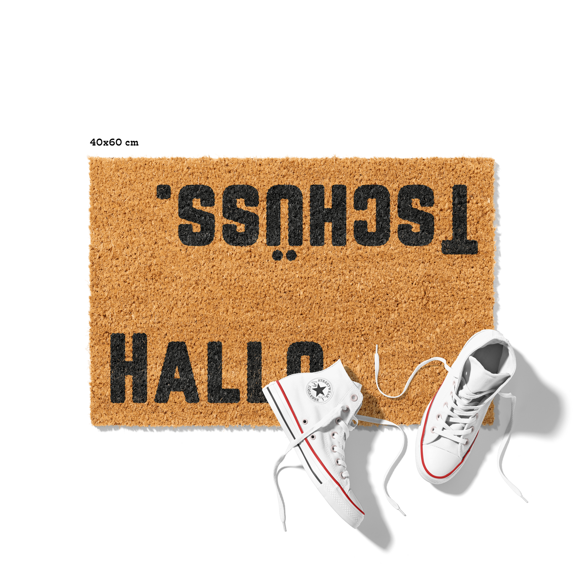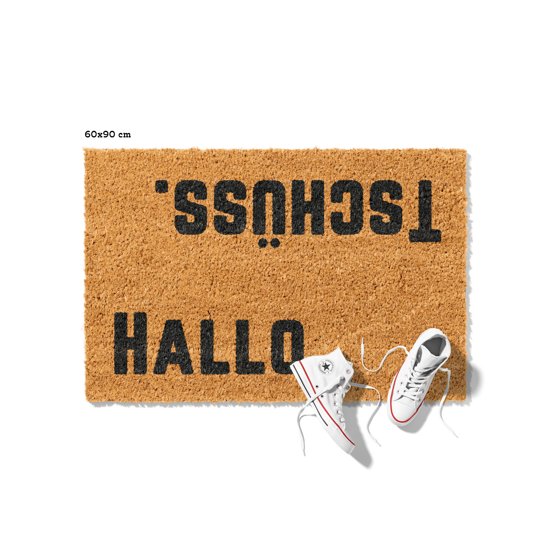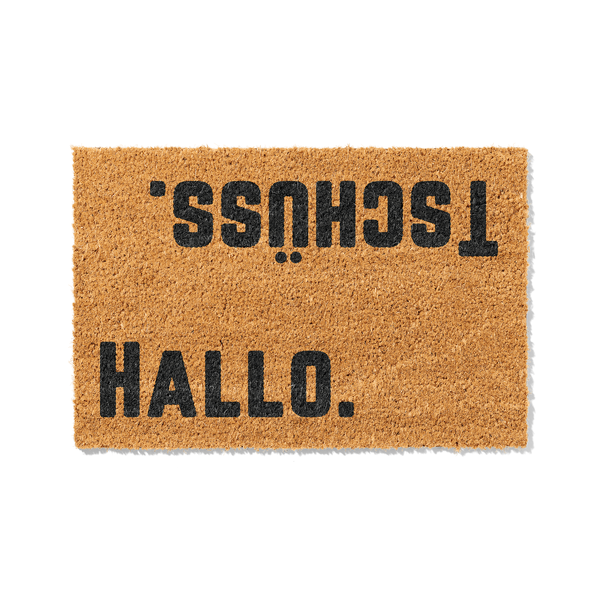 Dieses Motiv kombiniert „Hallo“ und „Tschüss“ in einer klaren, grafischen Gestaltung. Der obere Schriftzug ist bewusst gedreht angeordnet und sorgt für einen visuellen Effekt beim Betreten oder Verlassen des Hauses. Auf der natürlichen Kokosoberfläche wirkt der dunkle Druck kontrastreich und modern. Eine Fußmatte für alle, die ihren Eingangsbereich mit einem durchdachten Wortspiel gestalten möchten.