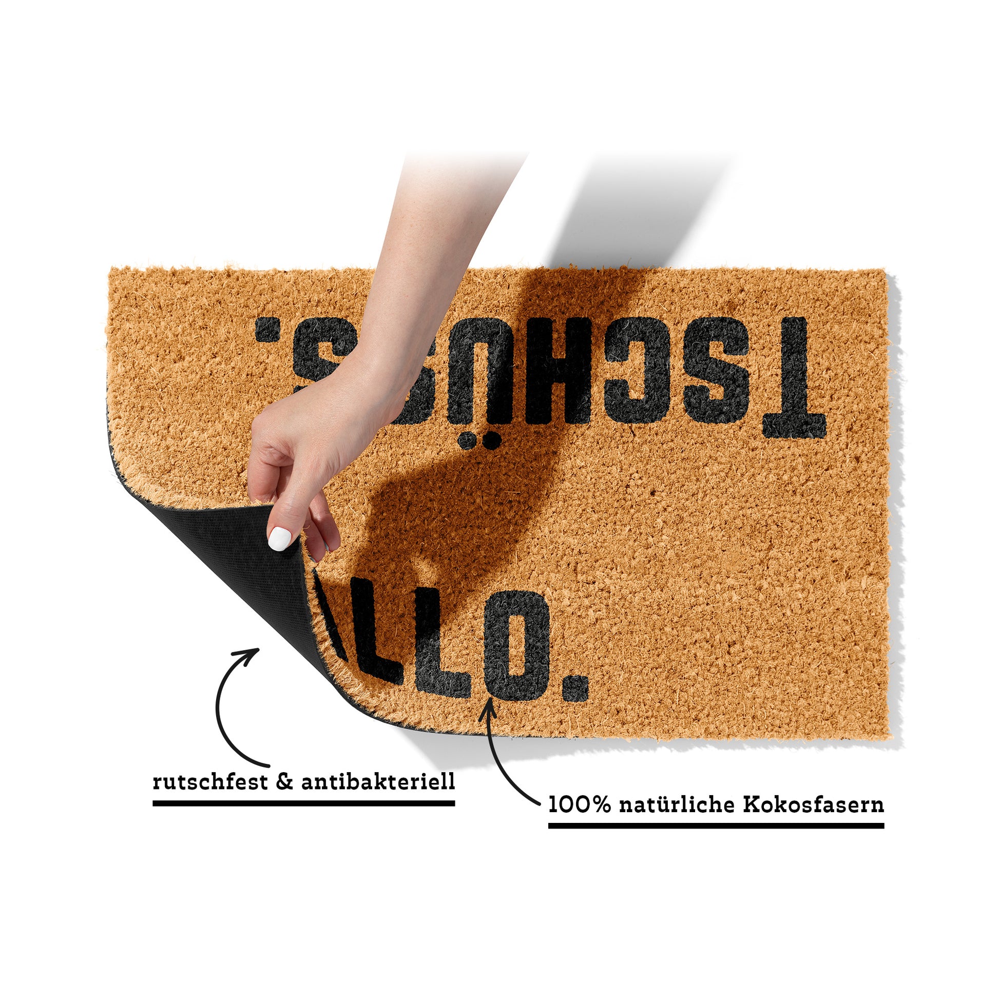 Fußmatte aus Kokos mit lustigem Spruch – „Hallo Tschüss"