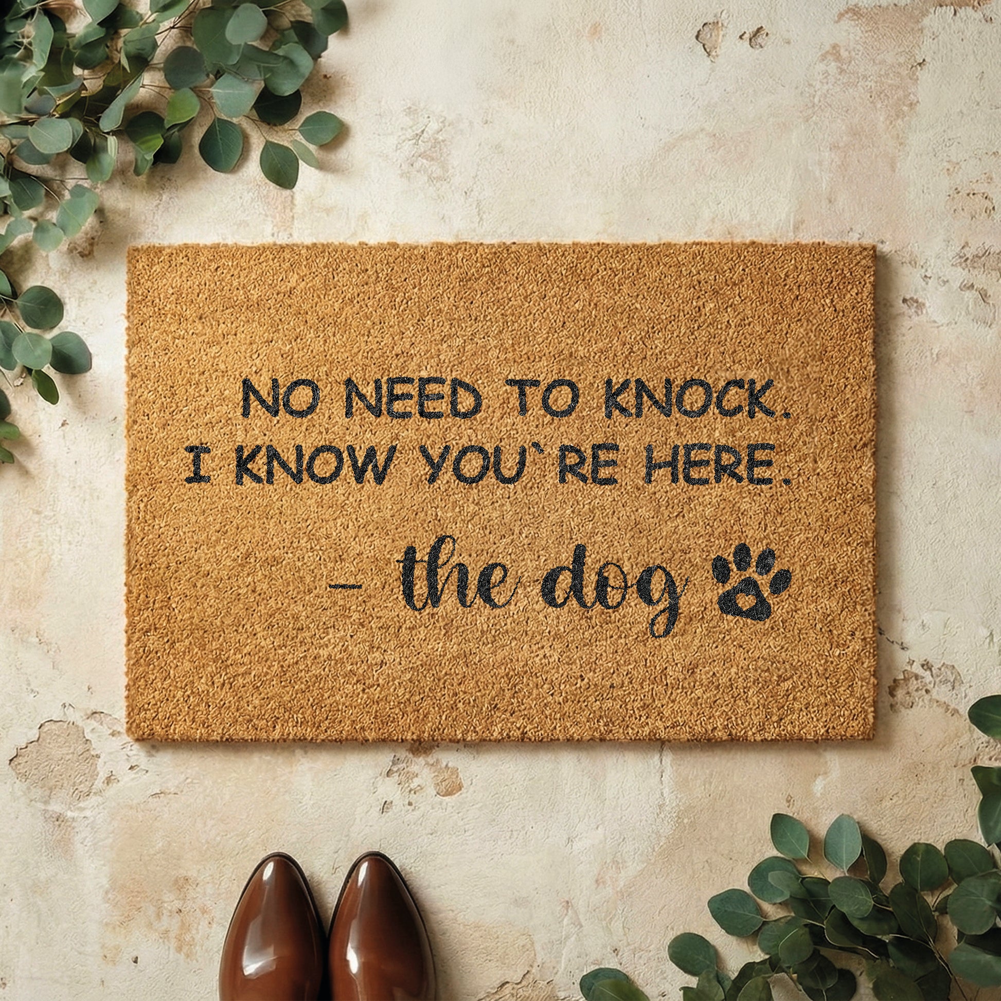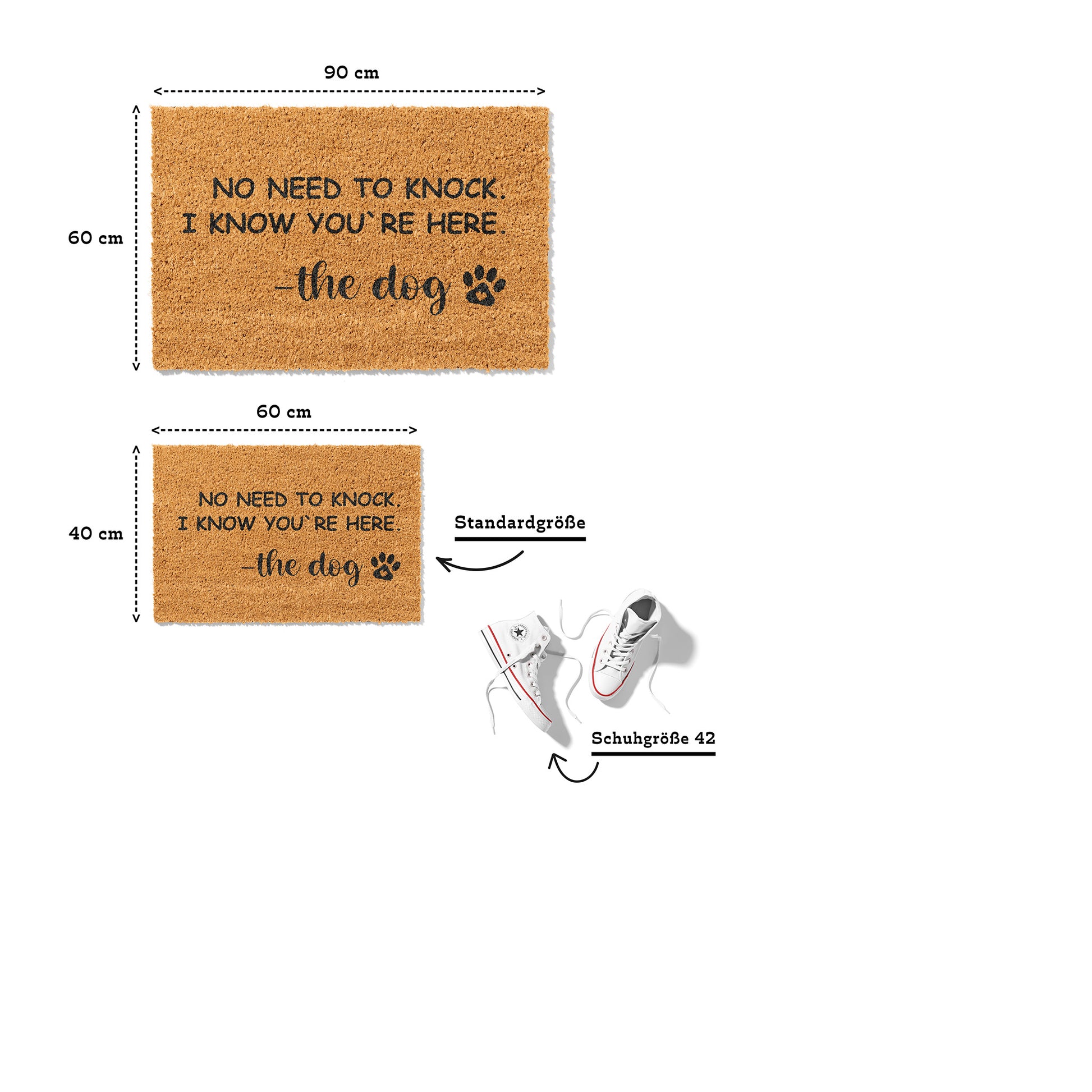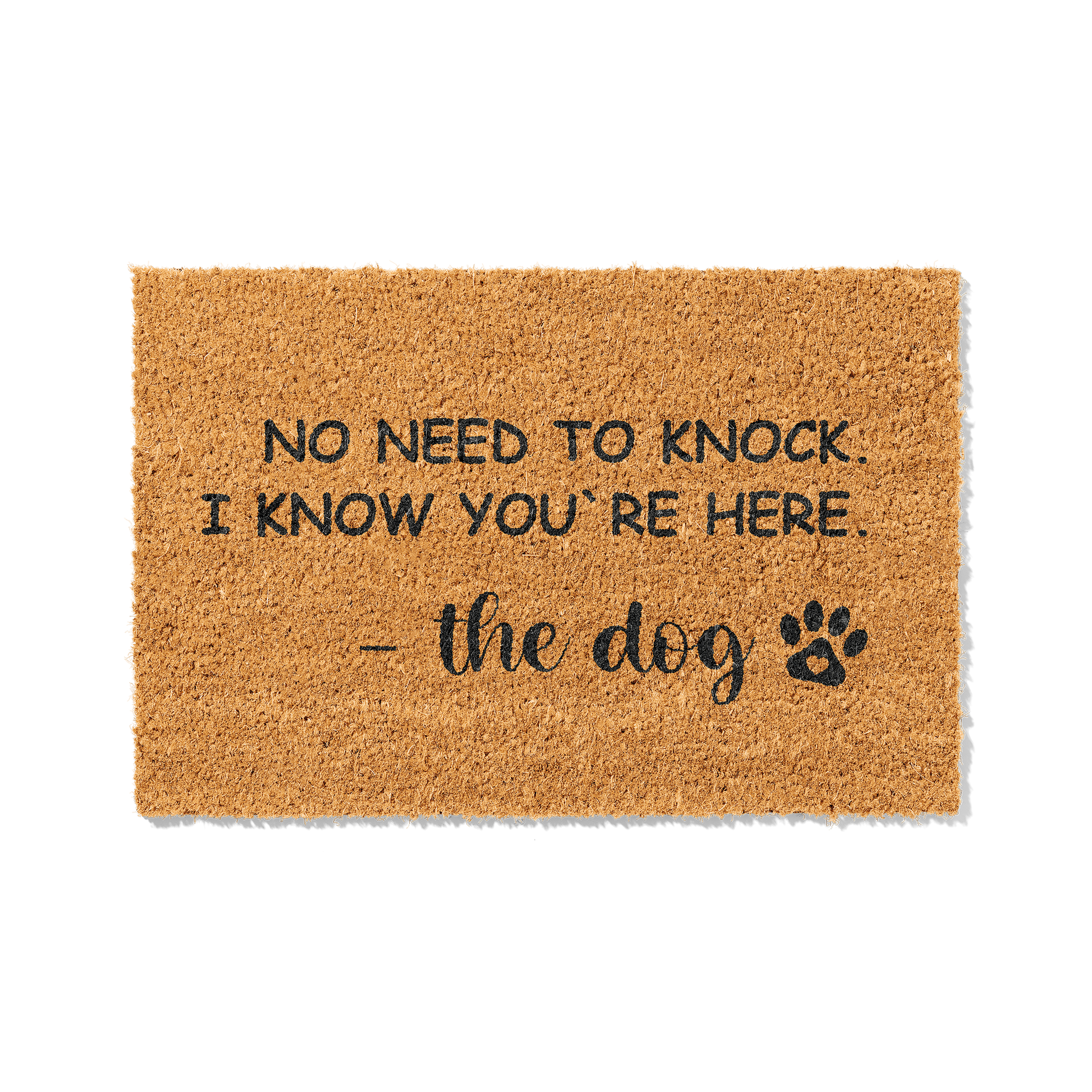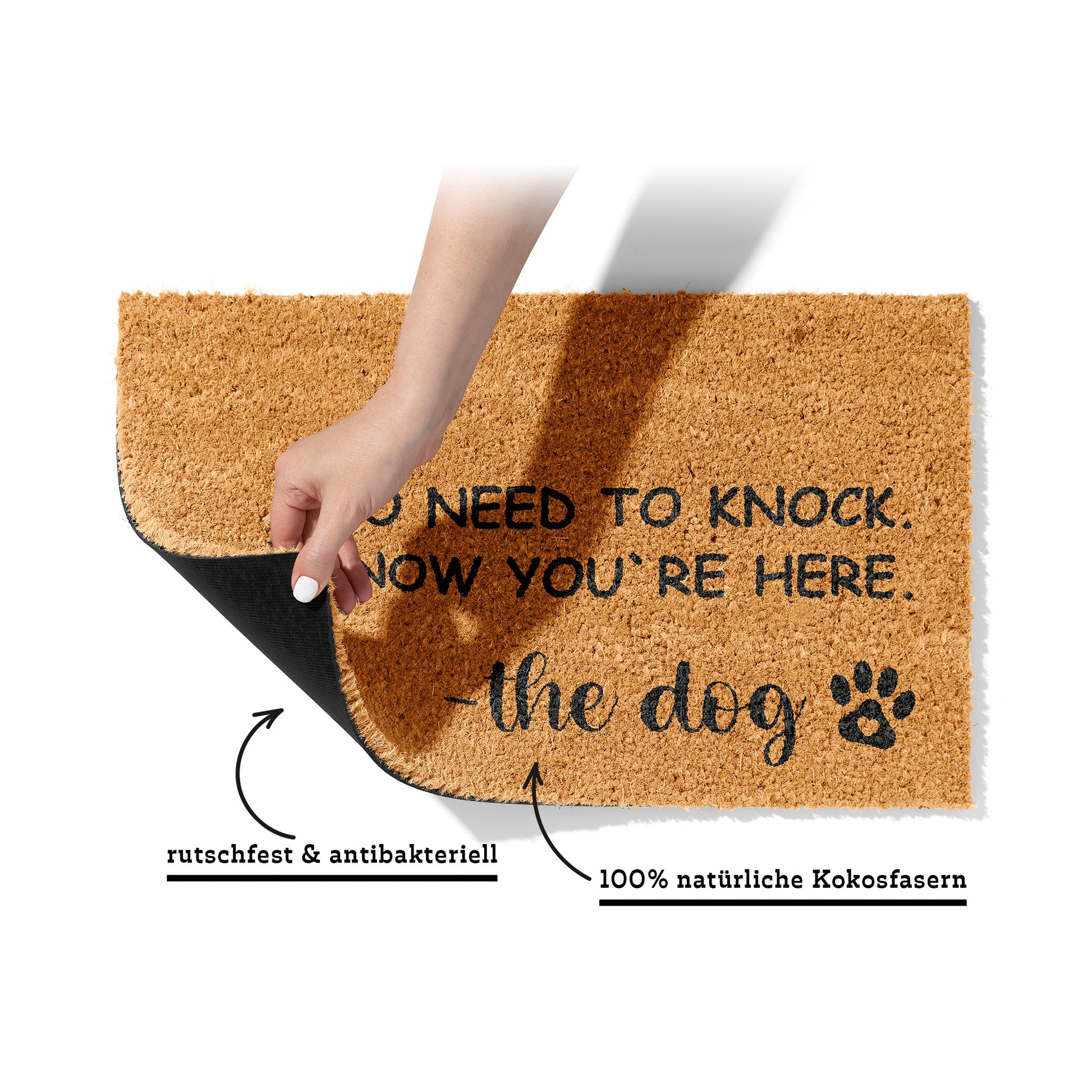 Fußmatte aus Kokos mit lustigem Spruch – Hundemotiv „No Need to Knock"