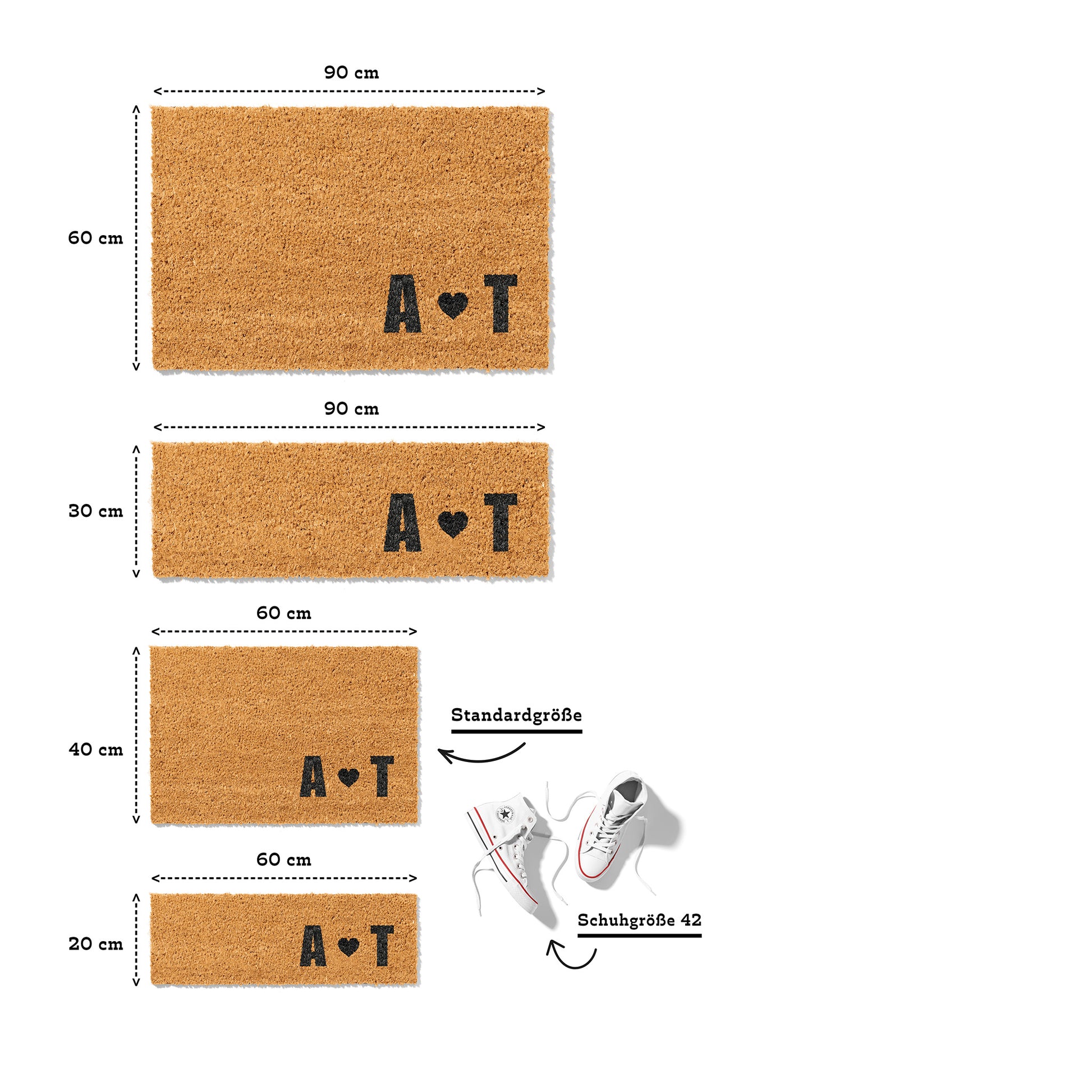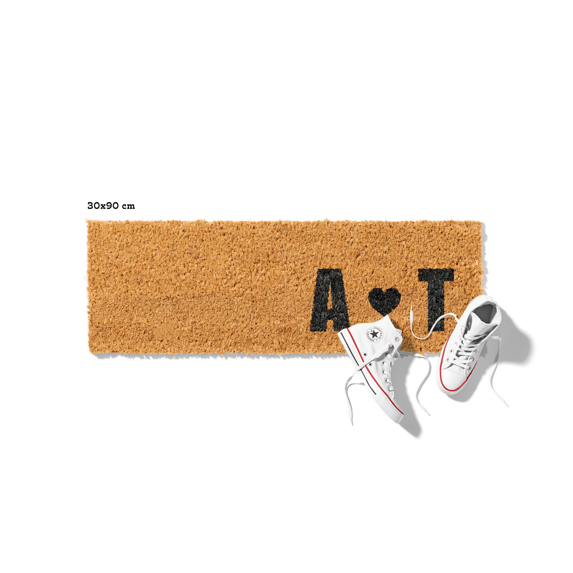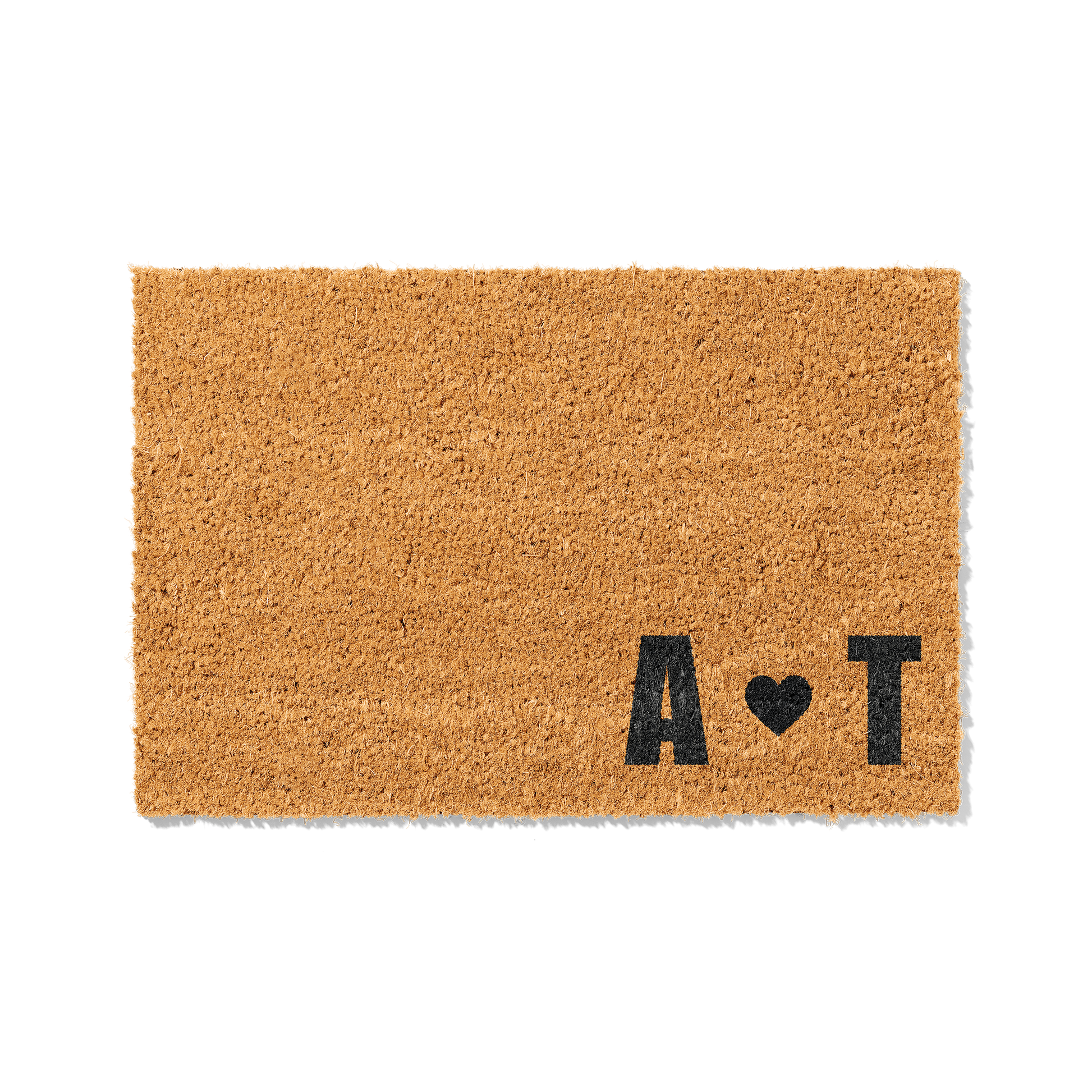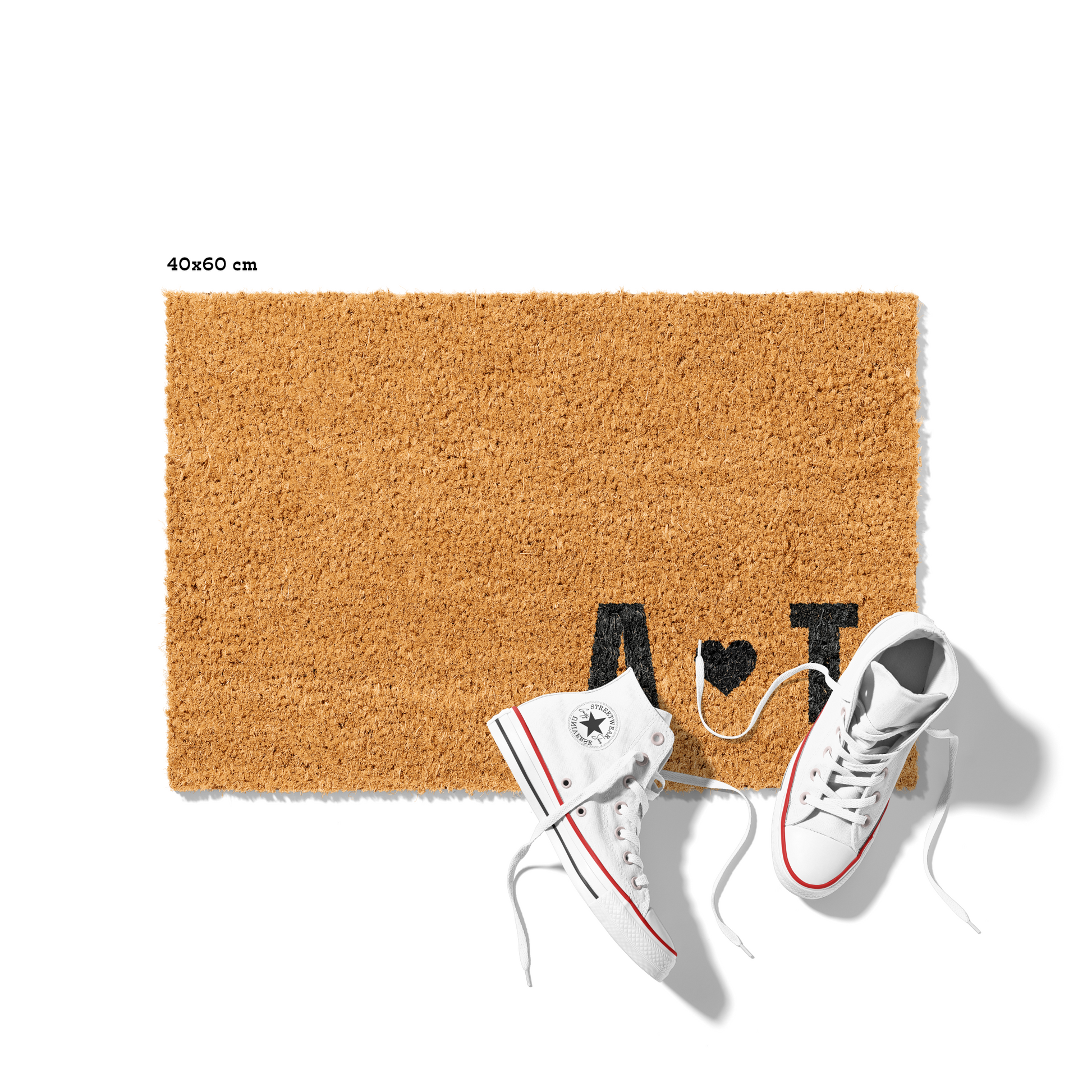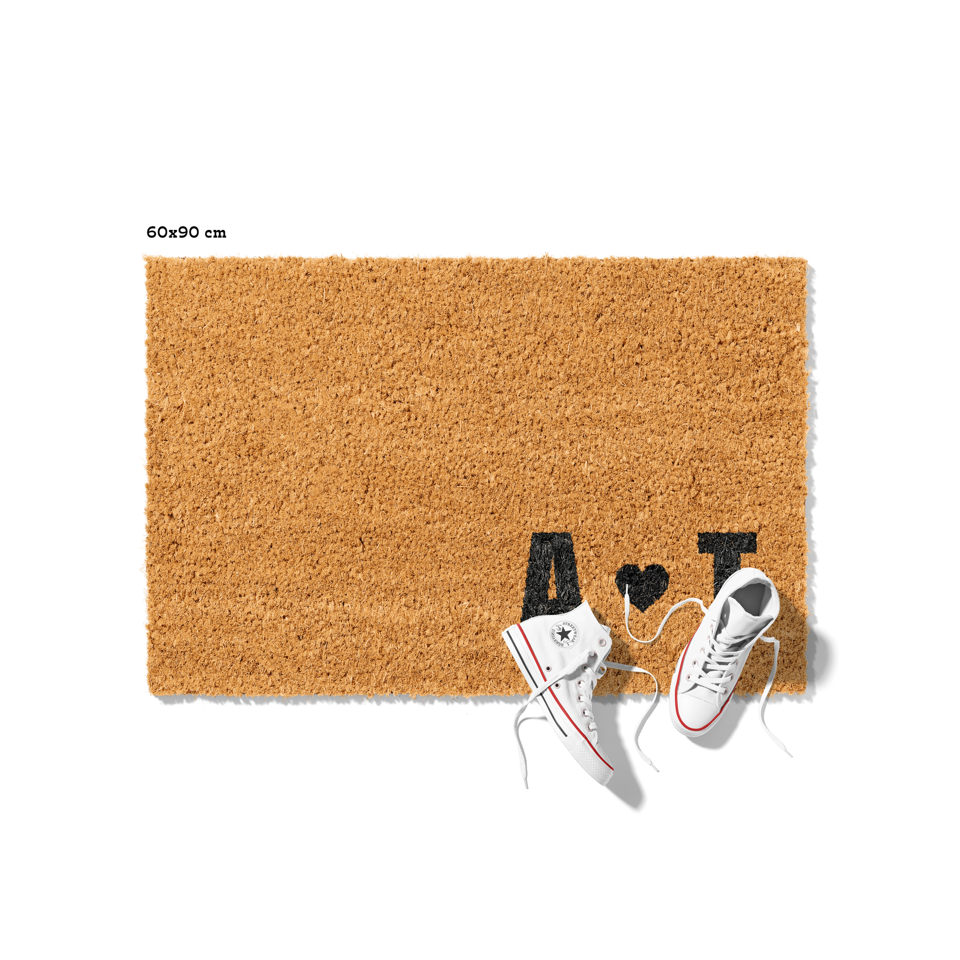 Dieses Motiv setzt auf ein reduziertes Initialen-Design mit einem kleinen Herz als Verbindungselement. Die Buchstaben stehen dezent in einer Ecke und wirken dadurch modern und unaufdringlich. Auf der natürlichen Kokosoberfläche entsteht ein klarer Kontrast, der trotzdem ruhig bleibt. Eine Fußmatte für Paare, die ihren Eingangsbereich persönlich gestalten möchten – ohne großen Schriftzug.