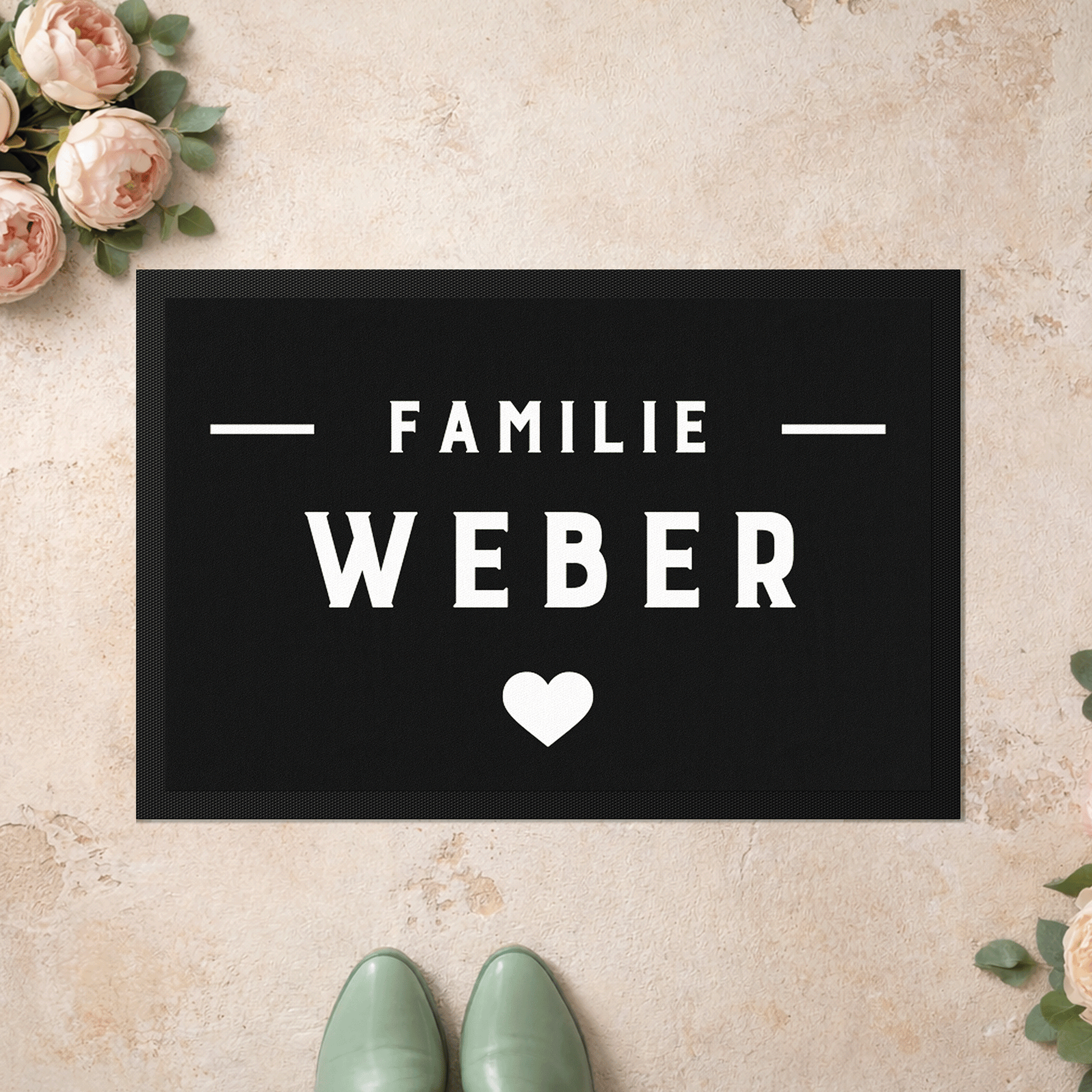 Flache personalisierbare Stoff-Fußmatte – Familienname mit Herz im klaren Design