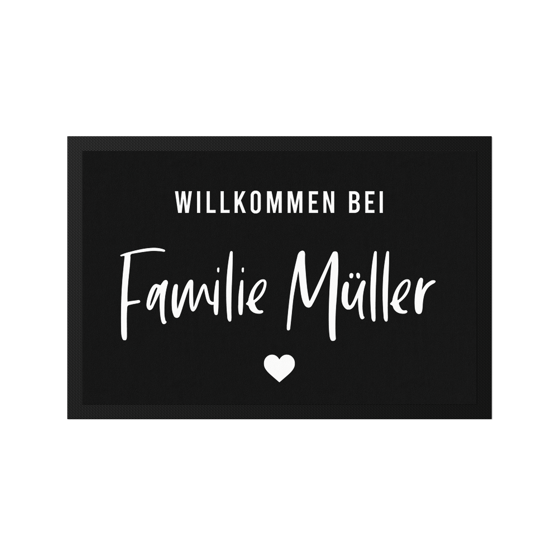 Stoff Fußmatte personalisierbar – Willkommen bei Familie mit Herz im Handlettering-Stil
